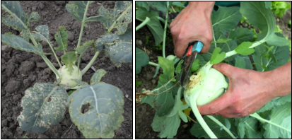 Zur Ernte drückt man am besten die Außenblätter nach unten und schneidet dann den Kohl am Strunk mit einem Messer ab. Wartet man zu